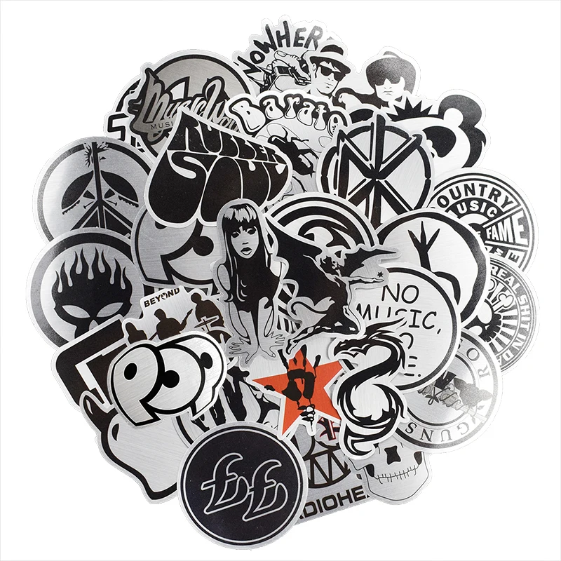 Limited Offer of 50 Pcs Metallic Black and White Punk Rock Music Graffiti Sticker Waterproof Luggage Guitar Skateboard Car PVC Stickers Toys